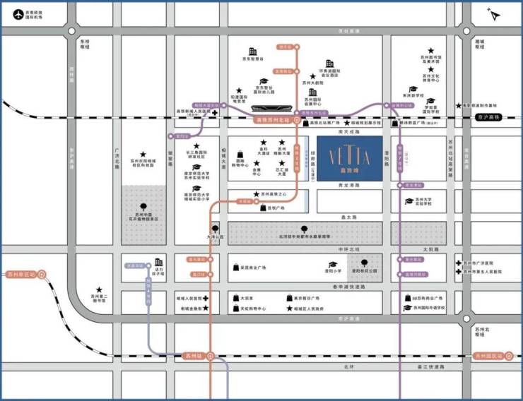 项目周边的配套不错,有两条轨交线,嘉致峰庭距离已开通的轨交2号线高铁苏州北站约730米左右,距离在建的轨交7号线青龙港站约600米左右。同时也有高铁北站,出行也很方便;