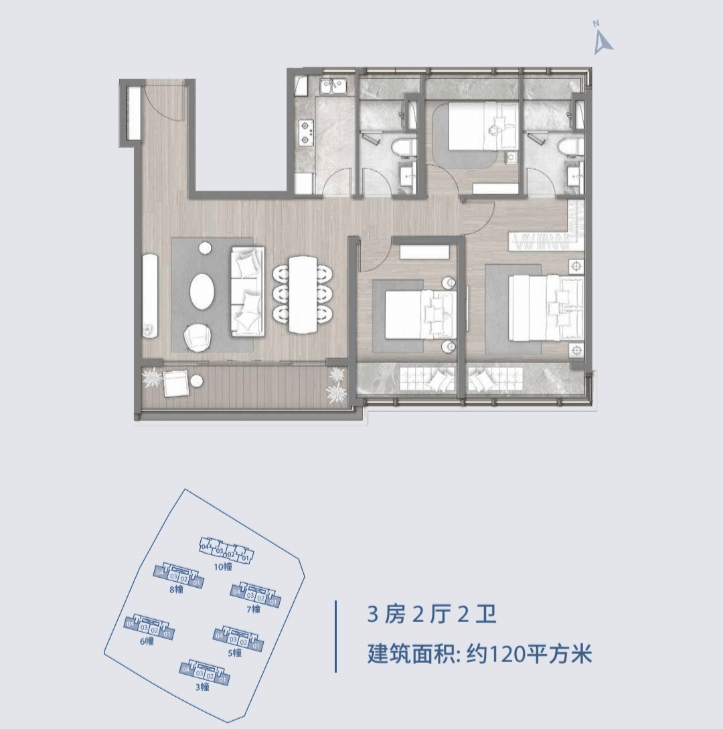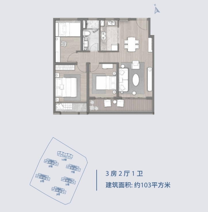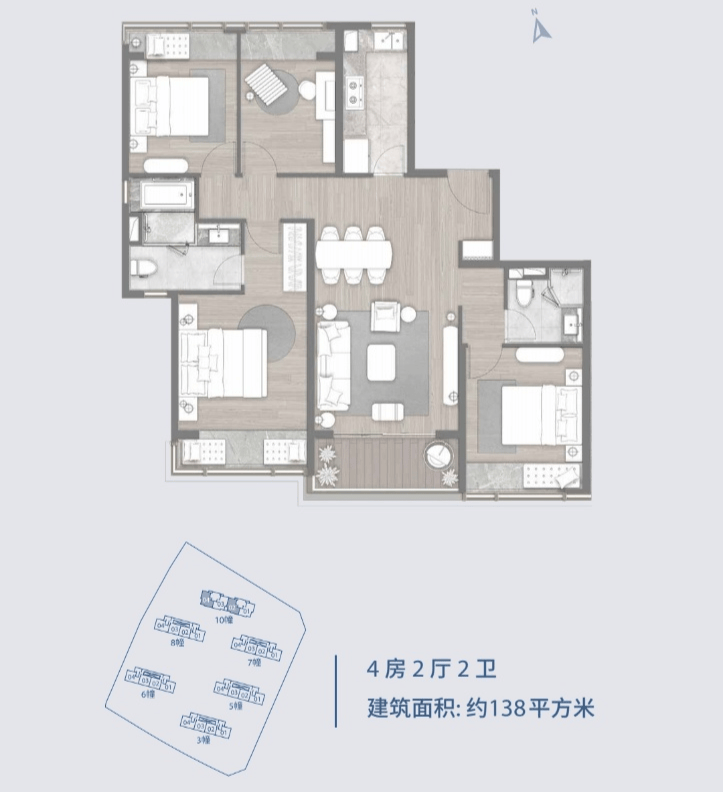 项目共有三种户型,建面约103㎡、120㎡、138㎡。其中,只有10#楼是建面约138㎡的户型,其余楼幢是边户120㎡、中间户103㎡。