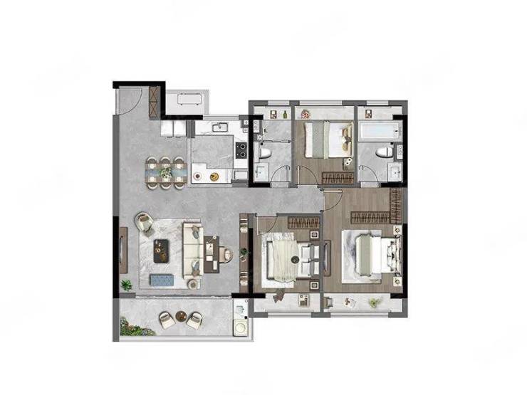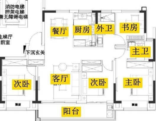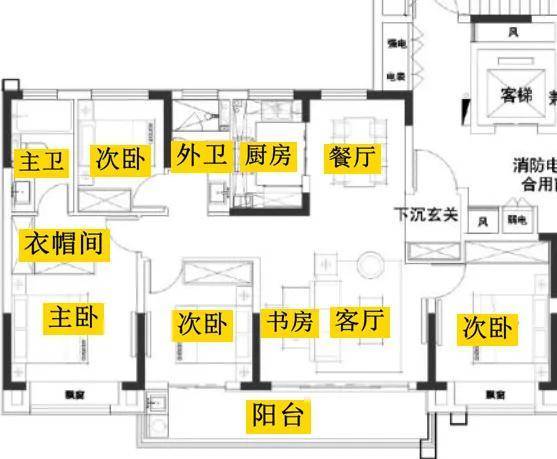 —边户:四房两厅两卫户型,五开间朝南,主卧套房设计带衣帽间。