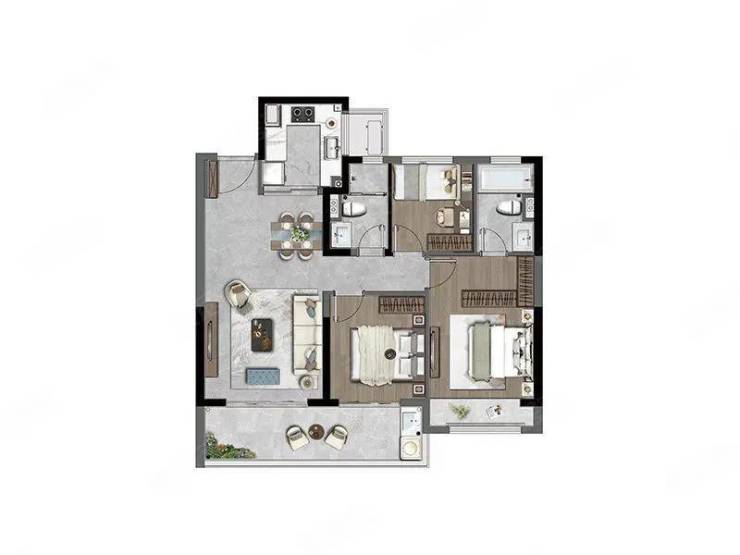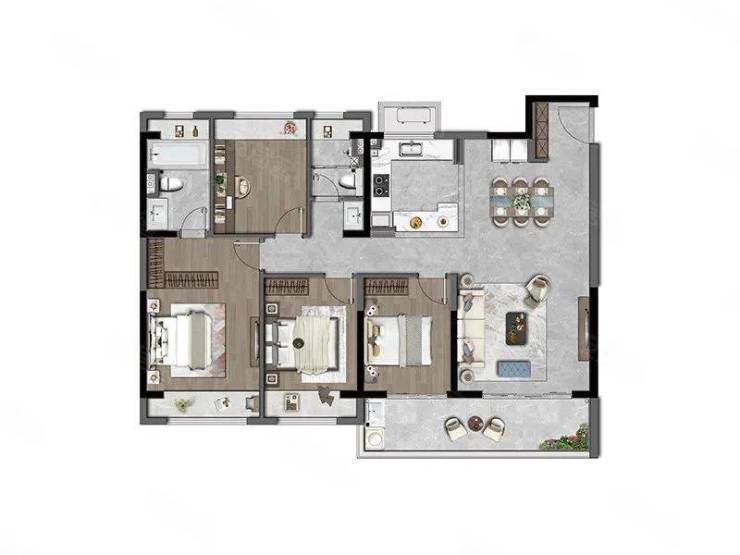 —中间户:四房两厅两卫户型,四开间朝南,主卧套房设计。