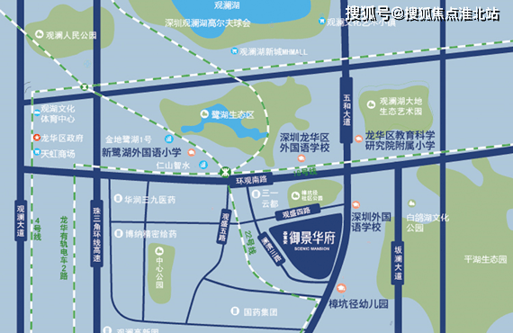交通配套:项目距离规划中的地铁 22 号线观湖枢纽站仅 400 米左右,未来地铁 18 号线也将在观湖站交汇;距离龙华有轨电车高新区东站直线距离约 500 米,可连接地铁 4 号线。周边还有梅观高速、机荷高速、五和大道等干道,可快速通达全城。