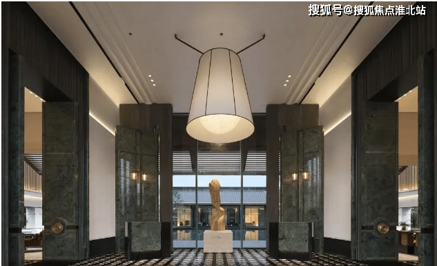门厅的拼花地砖、吊灯、石门及木雕等,彰显品质。会客厅以实木和大理石为主材,营造高奢氛围,墙面装饰精致,沙发与茶几搭配和谐。艺廊旁空间与窗外景色相互映衬。