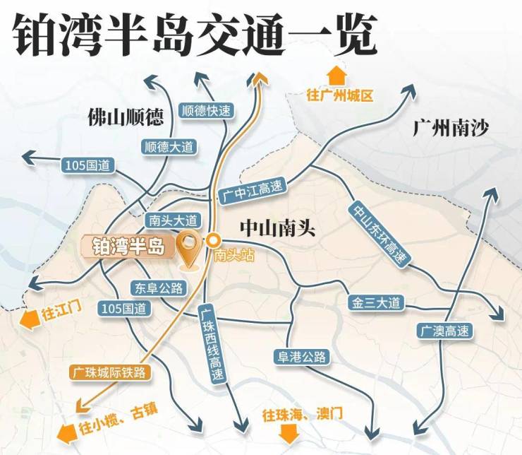 项目位于中山北部南头镇,广佛中交汇处,粤港澳大湾区中⼼,重点交通枢纽。