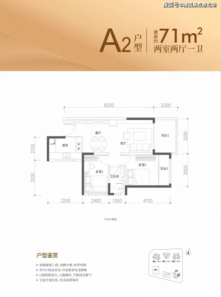 71㎡的2房2厅1卫,设计的是竖厅格局,客厅3.2米开间,进深8.2米,2个卧室分别做到了主卧12.5㎡/次卧9.12㎡(包含墙体飘窗),得房率约88%(包含赠送),东南朝向。