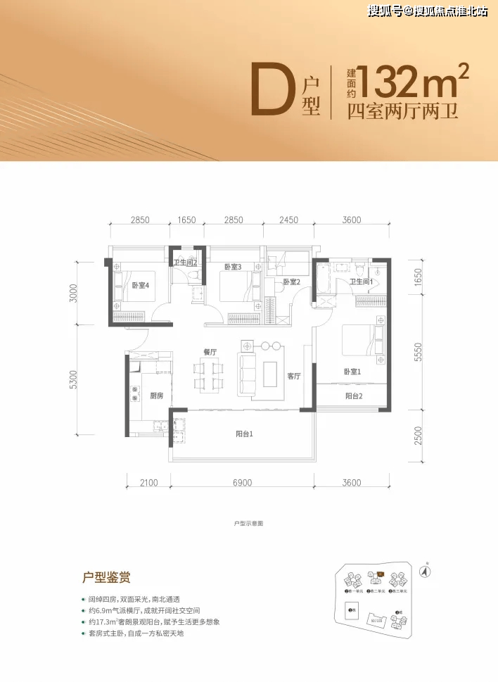 132㎡的4房2厅2卫,设计的是横厅南北通透格局,客餐厅6.9米开间,四开间朝南,4个卧室分别做到了主卧19.98㎡/次卧10.26㎡/次卧10.26㎡/次卧8.82㎡(包含墙体飘窗),得房率约90.2%(包含赠送),阳台主朝正南向。