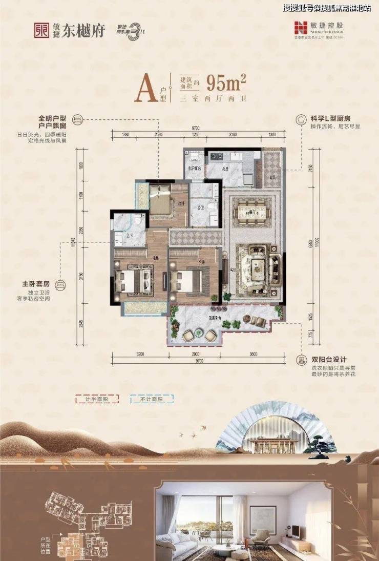 【建面约95㎡】让三代同堂和二胎家庭生活游刃有余,户户三开间朝南,部分户型双阳台设计,南向无遮挡,视野开阔
