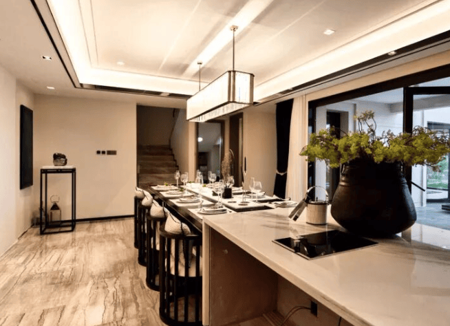 采用新亚洲建筑风格,精心选用金属质感的陶瓦构筑屋顶,葡萄牙米黄哑光石材铺就外立面,勾勒出 “素墙黛瓦” 的东方意蕴。