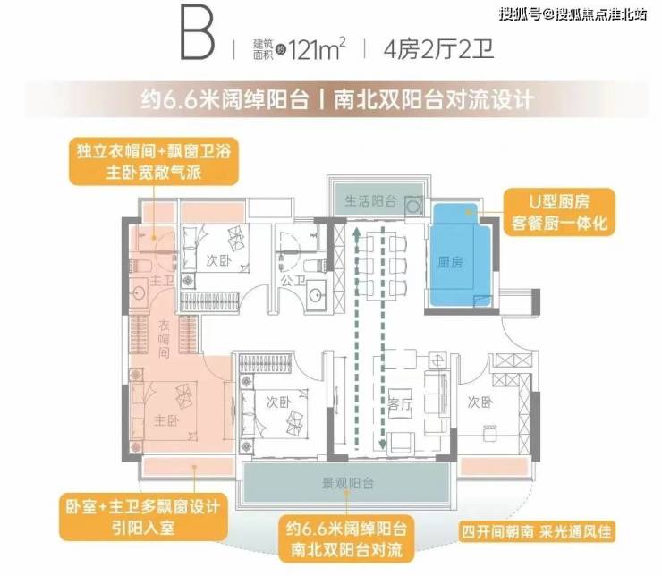 这个户型四开间朝南的同时还拥有约12.6m的采光面,南北通透。