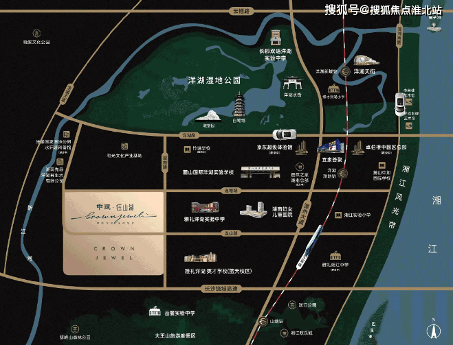 生态配套:项目毗邻约 7200 亩的 4A 级洋湖国家湿地公园,背靠狮子山森林公园,远眺岳麓山,紧邻靳江河,周边还有寨子岭、桃花岭等森林公园环绕,3km 范围内有 32 个公园,生态环境优越。