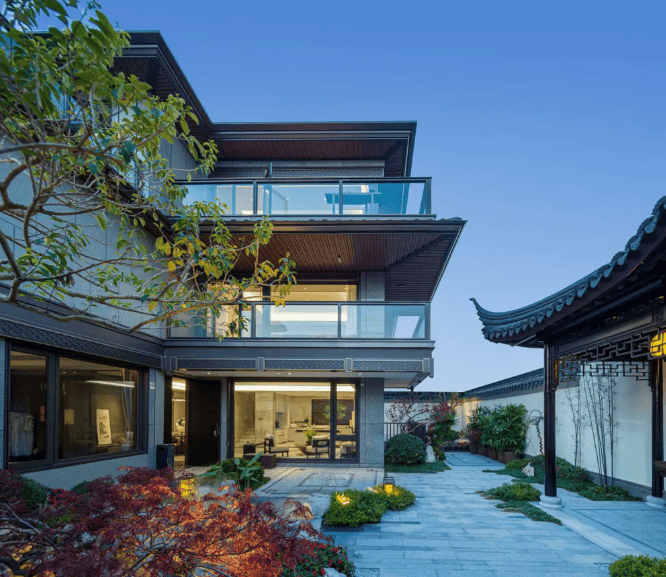 景观设计:特邀香山帮匠人,以苏州网师园为蓝本打造园林,以太湖石堆叠成微缩山水,引入活水,设月洞门等景观,中轴礼序规划,亭台飞檐次第展开,呈现出 “一步一景、层层递进” 的江南诗意栖居意境。