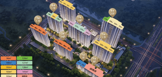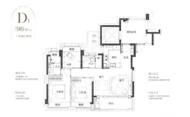 建筑面积约 96㎡/103㎡三房两厅两卫:户型设计方正,空间利用率高,动静分离,配有独立玄关,提升隐私性能,卧室朝南,采光充足,厨卫全明,通风良好。