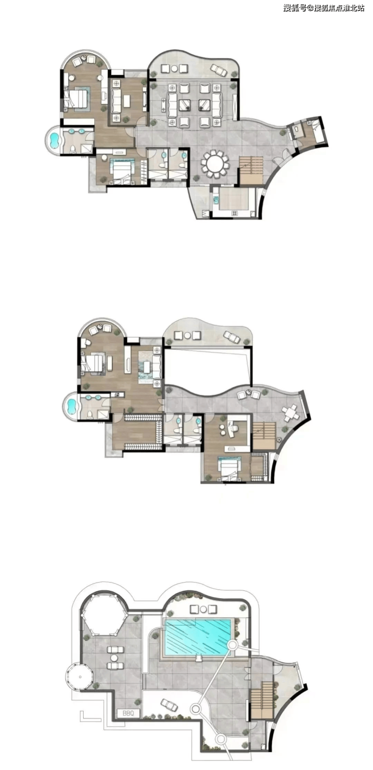 再细看,约458平、467平、564平顶复户型图参考如下,为双层结构,且赠送多一层露天泳池花园,相当于有3层使用空间。