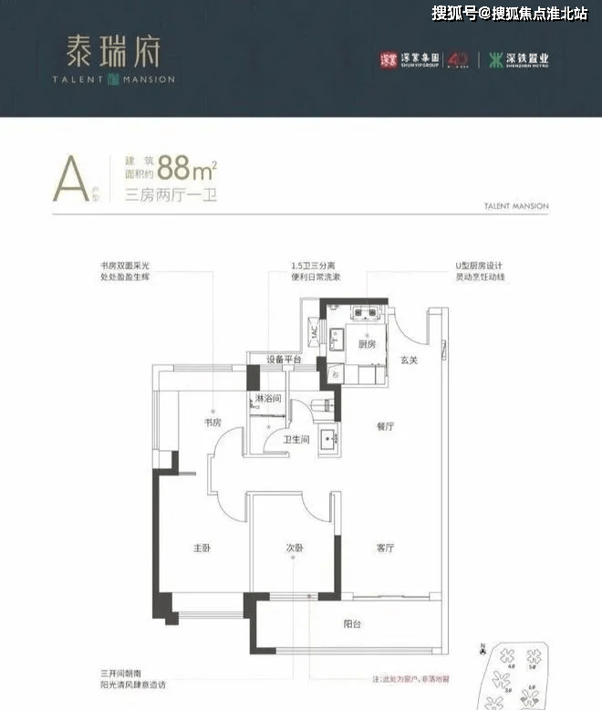 全南朝向:主要生活空间南向设计,3开间朝南;