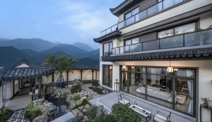 建筑风格:项目借势约 10 米原山缓坡高差,打造 “步步高升” 的台地格局。建筑提炼唐风宋韵,以白墙黛瓦的经典中式格局为基底,融入大面积玻璃、大开间尺度等现代手法,既保留东方美学,又满足当代居住需求。