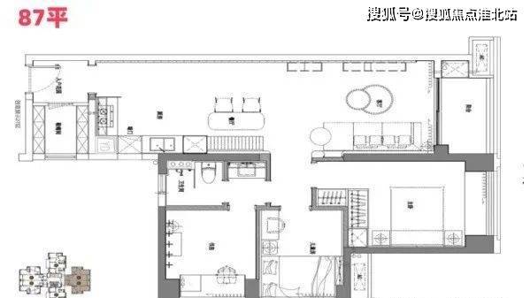 建面87㎡:正北向三房两厅一卫,带有入户花园,整体实用空间有待改进,厨房位置需自行间隔或开放设计。